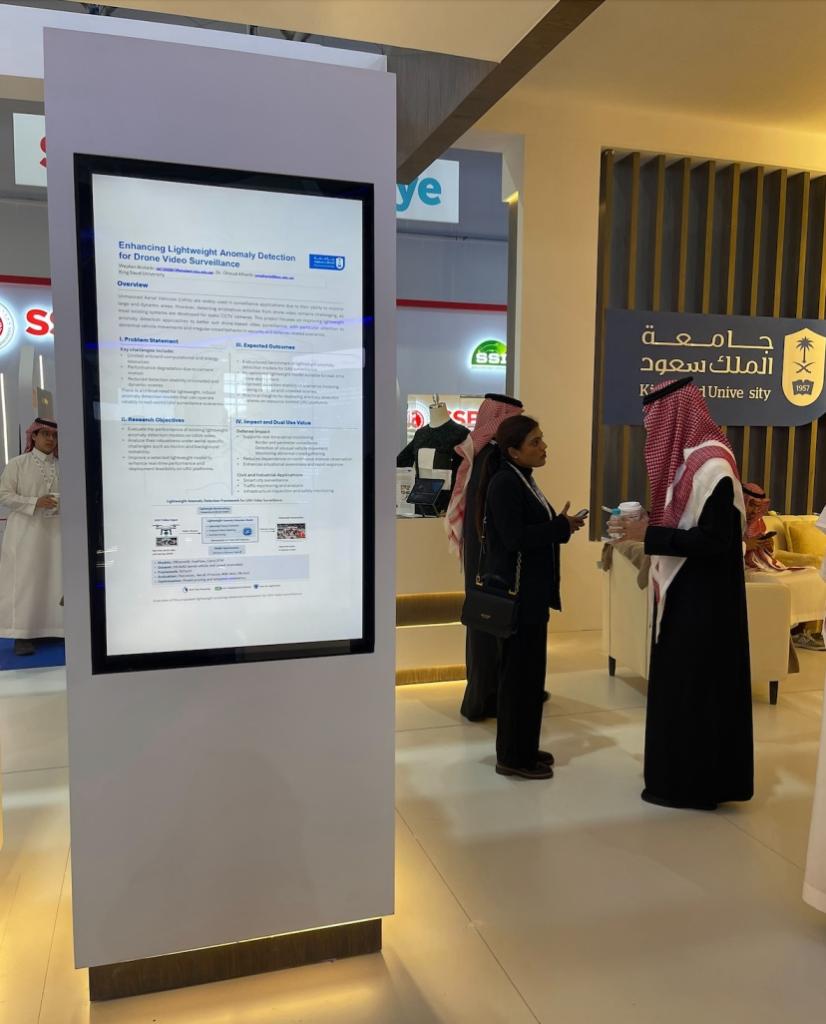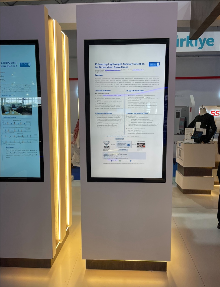 As part of ongoing research activities in intelligent surveillance and autonomous systems, MSc student Wejdan Alotaibi participated in the World Defense Show 2026 in Riyadh with her project titled “Enhancing Lightweight Anomaly Detection for Drone Video Surveillance.”